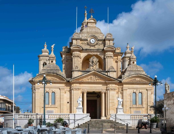 A majestic frontal view of the Basilica of St Peter and St Paul in Nadur. The intricate baroque facade, flanked by statues and crowned with a clock tower, rises against a vivid blue sky. Tables in the square reflect the church's central role in village life.