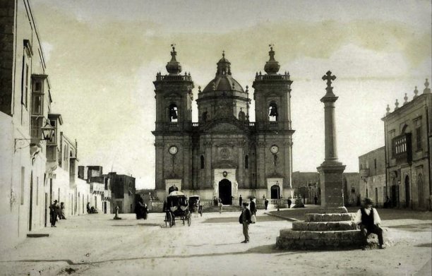 This captivating photograph from the 1910s showcases Xagħra Square, with its centerpiece, the Church of the Nativity of Our Lady, standing in stately grandeur. The baroque architecture, featuring twin bell towers and a prominent central dome, reflects the village's religious and cultural pride. The bustling square, dotted with horse-drawn carriages, locals in traditional attire, and the prominent stone cross, offers a vivid snapshot of daily life in early 20th-century Gozo, capturing the harmony between tradition and community.
