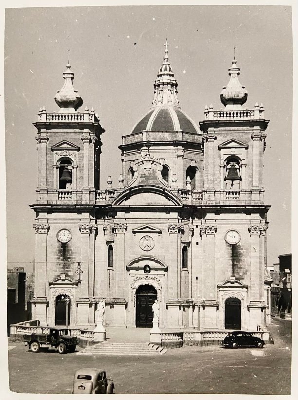 This historic photograph of Xagħra Square in the 1960s highlights the stunning Church of the Nativity of Our Lady before its elevation to basilica status. The imposing facade, with its twin bell towers and intricate baroque details, reflects the architectural pride of the village. The open square, dotted with vintage vehicles, serves as a timeless snapshot of daily life in Gozo during this transformative era.
