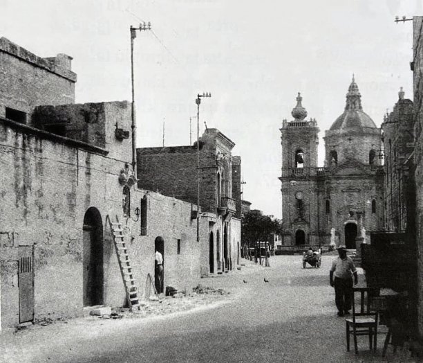 A historic view of Triq il-Knisja in Xaghra, with its charming mix of traditional Gozitan architecture and the iconic Basilica of the Nativity of Our Lady standing proudly at the end of the road. This retro photograph captures a slice of village life, complete with locals and vintage elements, showcasing Gozo’s enduring heritage. The rustic limestone buildings lining the street reflect the traditional craftsmanship of a bygone era, with intricate stonework, arched doorways, and weathered facades that tell a story of resilience and history.