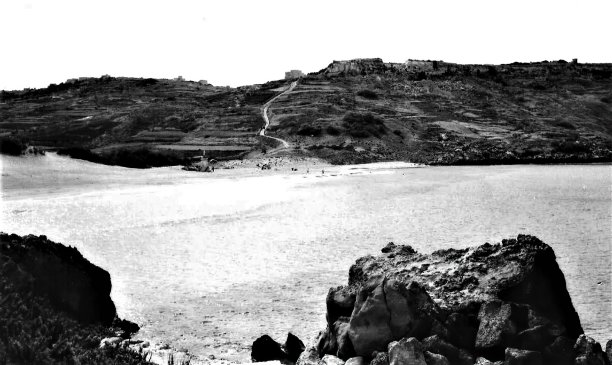A historic view of Ramla bay, from the 1950s, showcasing the wide stretch of sandy beach and the surrounding terraced fields leading up to the hills. A few tents and beachgoers are visible, reflecting the modest tourism of the time. A passage can be clearly seen leading to Calypso Cave.