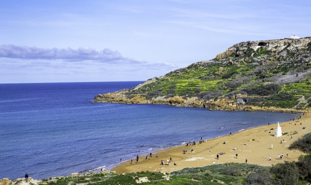 A breathtaking view of Ramla bay, known for its distinctive golden-red sand and crystal-clear waters. The scene captures visitors enjoying the tranquil beach, while lush greenery and rugged cliffs frame the coastline. Perched above the bay, Tal-Mixta cave is visible on the hillside, offering a natural vantage point with panoramic views of the Mediterranean.