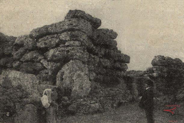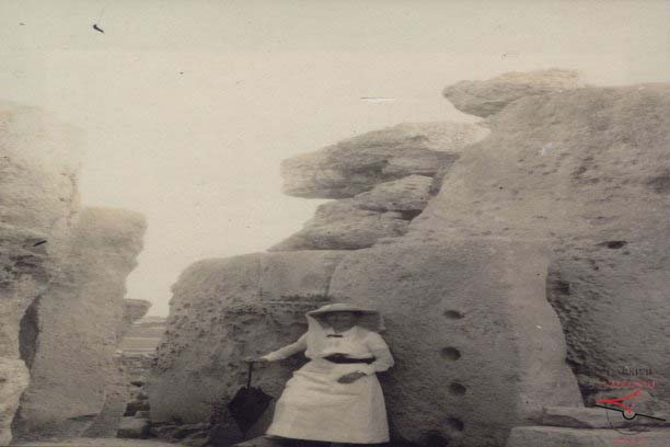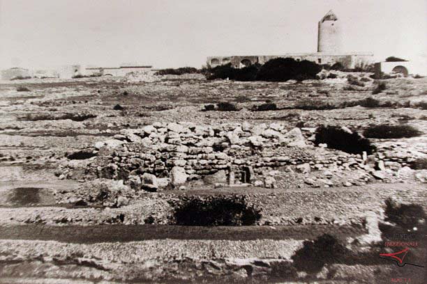 A 1910 photograph of the Ġgantija Temples in Xagħra, showcases the ancient megalithic structures partially covered by surrounding vegetation and agricultural terraces. The imposing ruins, believed to date back to around 3600 BC, are among the oldest freestanding monuments in the world. In the background, a traditional windmill towers over the site, adding a historical context to the rural landscape.