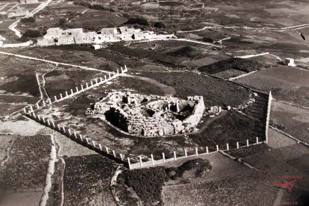 An aerial view of the Ġgantija Temples taken in 1960 showcases this prehistoric site encircled by a protective boundary. The ancient structure, dating back to 3600 BC, is situated amidst agricultural fields and stone-walled terraces. The image highlights the massive limestone blocks forming the temple complex, emphasising its historical and architectural significance as one of the world's oldest free-standing structures, located in Xagħra.