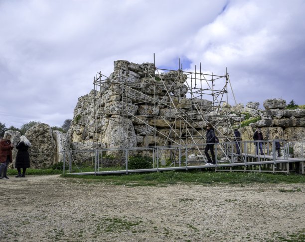 A view of the ancient Ġgantija Temples in Xagħra, with scaffolding erected as part of ongoing conservation efforts. The massive limestone megaliths, some dating back over 5,500 years, showcase the impressive engineering of Malta’s prehistoric inhabitants. Visitors explore the site along an elevated walkway, admiring the towering stone structures that form part of one of the world's oldest freestanding temples.