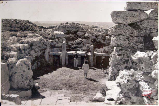 A 1933 photograph of the South Temple at the Ġgantija complex, taken from the facade looking inward. The image reveals the impressive megalithic architecture and the monumental entrance stones leading to the temple's inner sanctuaries.