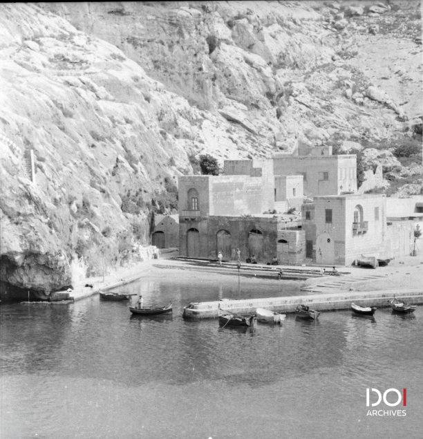 A historic glimpse of Xlendi Bay, showcasing its quiet charm before modern development. The image captures the serene waterfront with traditional boats floating in the calm waters. To the left, Tad-Dghajjes Cave is visible at the base of the cliffs, with the iconic zigzagging stairs leading up towards the rugged landscape. The modest stone buildings lining the shore reflect the simple yet functional architecture of the time.