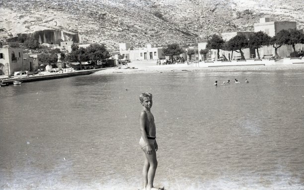 This black and white photograph, taken in 1957 at Xlendi bay, captures young Bruce Williams standing on the rocky shoreline, gazing at the camera. Dressed in simple swimwear, he appears relaxed, enjoying a peaceful day by the sea. In the background, a group of children swims in the calm bay while limestone buildings, trees, and a small pier line the shore. A statue and parked vehicles suggest a modest but lively seaside village setting. Captured by his father, Maldwyn E. Williams, this image preserves a timeless moment of childhood in a tranquil Mediterranean landscape.
