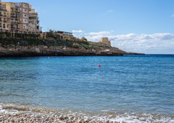 This view of Xlendi bay showcases the striking contrast between modern development and historical heritage. In the foreground, the calm waters gently lap against the pebble shoreline. On the left, contemporary apartments rise above the cliffs, reflecting the village’s expansion into a popular coastal destination. In contrast, the historic Xlendi Tower which was built in the 17th century as a coastal defence, stands resilient in the background.