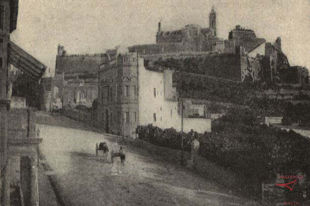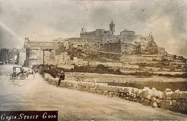 A serene glimpse of Strada Corsa, now Republic Street, in Victoria. The iconic Ċittadella towers over the scene, with horse-drawn carriages and traditional stonework reflecting the charm of a bygone era.