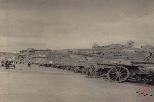 A historic view of Fortunato Mizzi Street lined with wooden carts, likely used for transporting goods and produce. The imposing Citadel dominates the background, standing as a symbol of Gozo’s fortified past. A few pedestrians can be seen strolling along the street, reflecting a time when daily life moved at a slower pace. The photograph captures the contrast between the bustling commercial activity on the street and the quiet resilience of the island’s historic architecture.