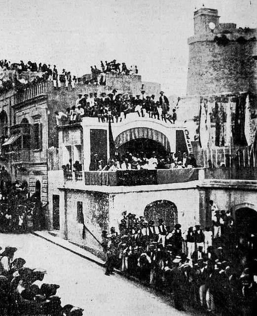 A historical photograph of Strada Fortunato Mizzi in Victoria, Gozo, previously known as Strada Corsa. The street is filled with people dressed in early 20th-century attire, participating in what appears to be a public celebration or procession. Flags and banners line the buildings, adding to the festive atmosphere. The architecture showcases traditional Maltese balconies and ornate façades, reflecting the rich heritage of Victoria’s main streets.